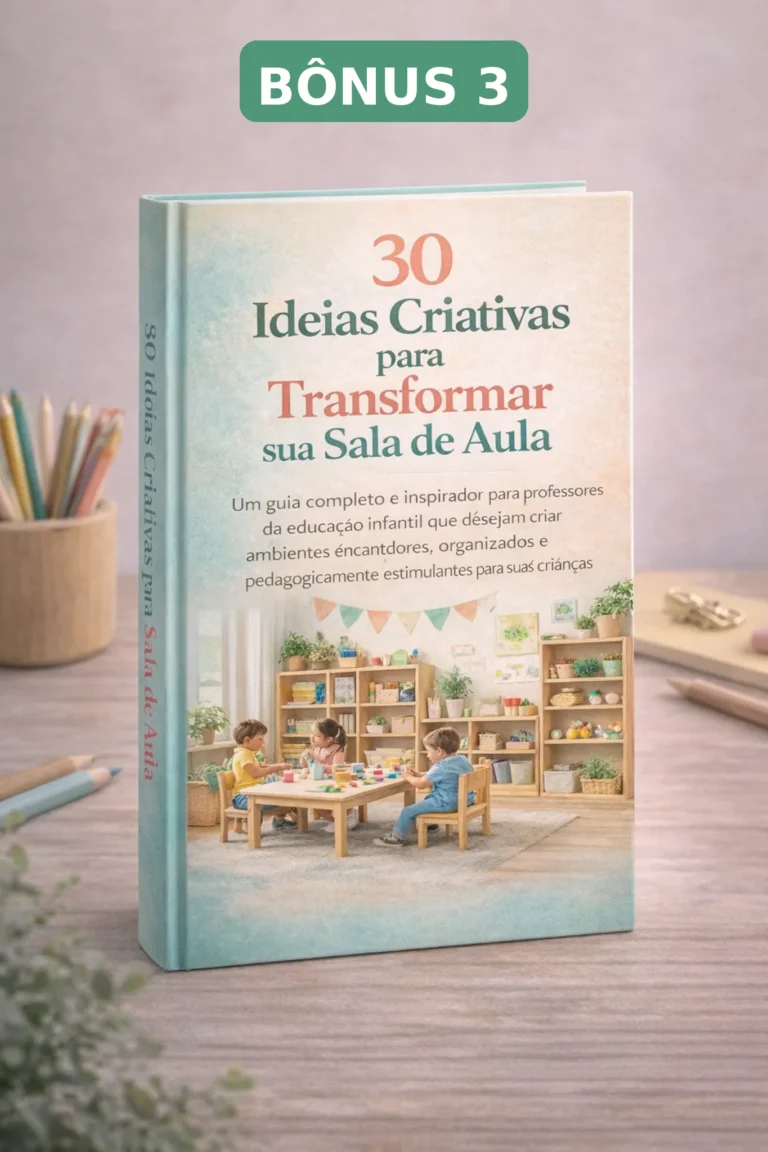 BÔNUS 3 - 30 Ideias Criativas para Transformar sua Sala de AulaUm guia inspirador que apresenta 30 ideias práticas para organizar, decorar e enriquecer a sala de aula da educação infantil, criando ambientes acolhedores, criativos e pedagogicamente estimulantes. O material traz sugestões simples de aplicar, com objetivos pedagógicos, materiais necessários e benefícios para o desenvolvimento das crianças.